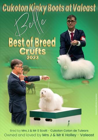 Belle first won BEST OF BREED AT CRUFTS AT 2 years old by international judge Mr E Engh. In 2025 she won BEST OF BREED at Crufts at 4 years old under judge Zena Thorn-Andrews.